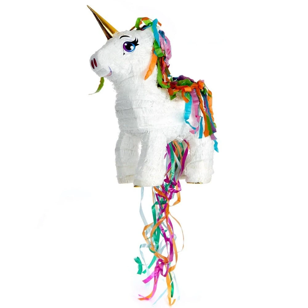 This sweet white unicorn with its rainbow tassels will brighten up any party! Big and colourful this party pinata will be a great centerpiece at your party. Take turns pulling the ribbons to reveal the booty inside!
