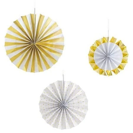 3 beautiful paper fans with gold foiled details. Perfect for all occasions. These fans can be closed and kept to reuse again.
