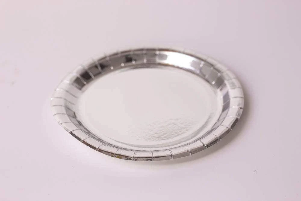 Shiny Silver Paper Plates. Designed to be mixed and matched with other plates, cups and napkins to style your party accordingly.