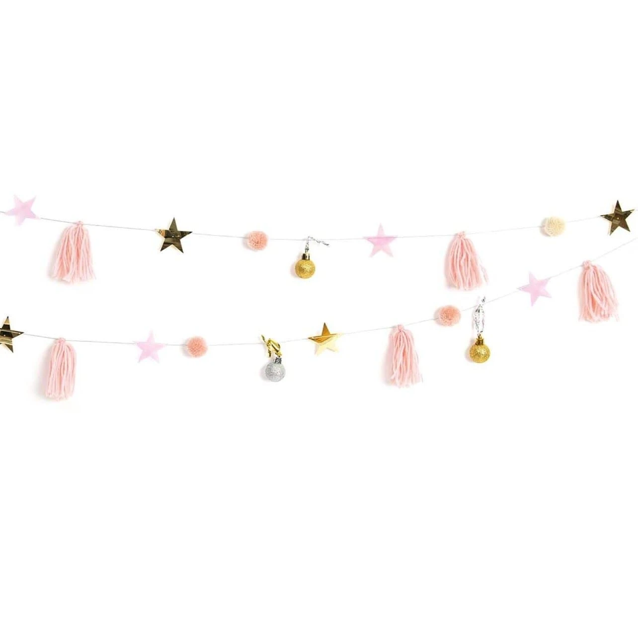 - Garland with 5 yarn tassels, 8 shimmering maxi sequins, 4 yarn pompoms and 4 baubles